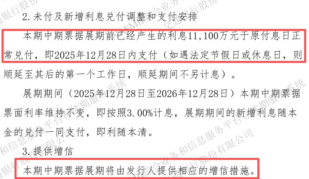 议案二为优化版本,在本金展期一年的基础上,承诺1.1亿元原利息于12月28日正常兑付,同时提出由万科提供增信,但未披露具体细节。这一调整与“22万科MTN004”二次方案的展期逻辑高度重合。