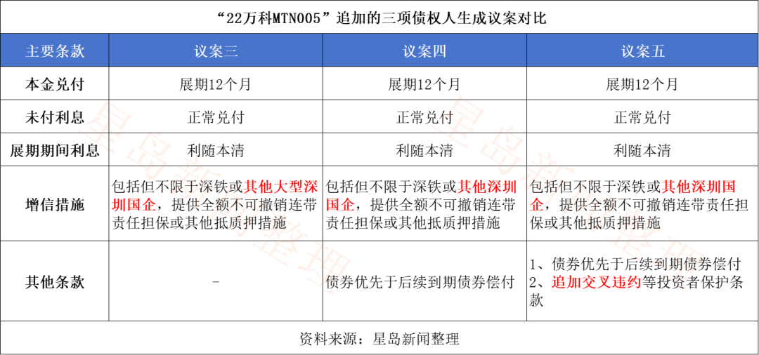 《星岛》梳理发现,“22万科MTN005”最新公布的六项议案中,有三项属于万科提出的原始议案,剩余三项均附带“追加投资人可以接受的”等表述,表明属于债权人直接提出补充议案或万科吸收债权人诉求后主动拟定的议案。