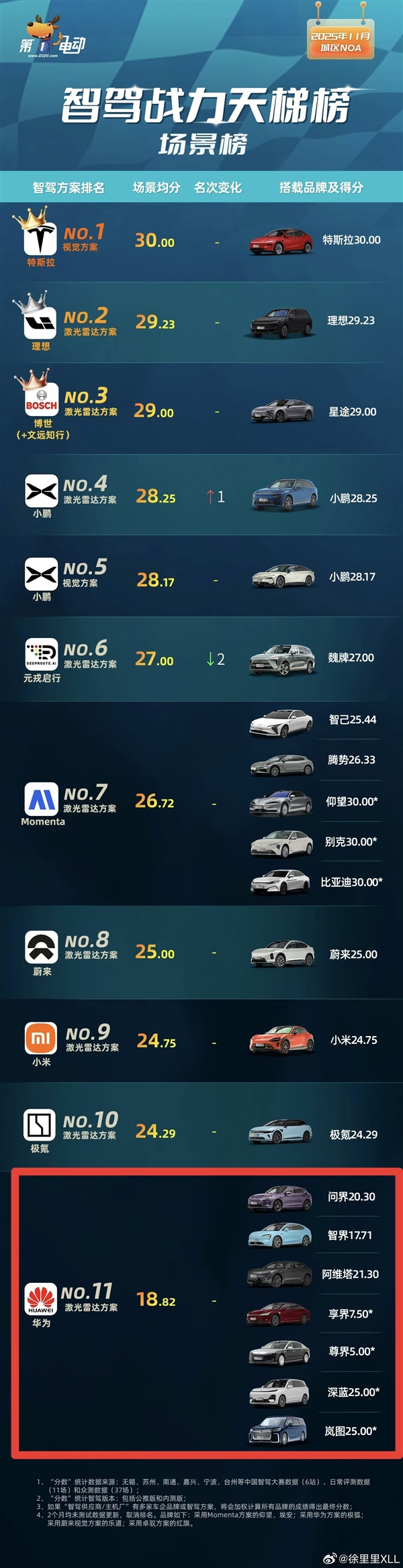 而采用激光雷达方案的华为则排在倒数第一名,其中尊界S800更是只获得了全场最低的5分,着实让人惊讶。