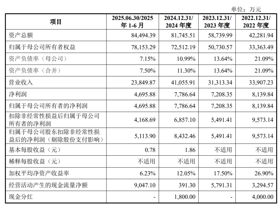 业绩方面,2022年至2024年及2025年上半年,优迅股份实现的营业收入分别为3.39亿元、3.13亿元、4.11亿元及2.38亿元;净利润分别为8139.84万元、7208.35万元、7786.64万元及4695.88万元。