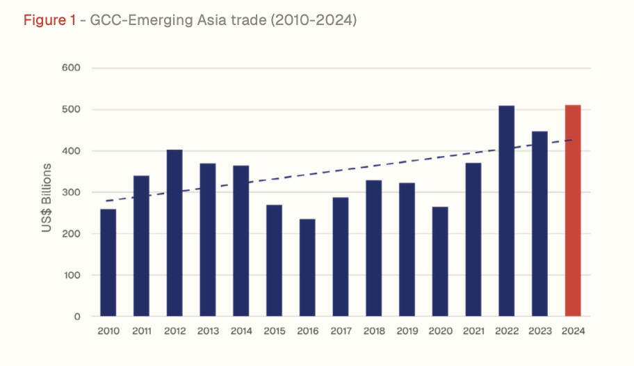 如果只看数据,2024年海湾与亚洲贸易达到5160亿美元的历史新高,看起来像是一轮强劲反弹。但在 Asia House 看来,更重要的并不是“涨了多少”,而是——海湾与亚洲之间的关系,正在从“能源换商品”,走向更深层次的结构性绑定。