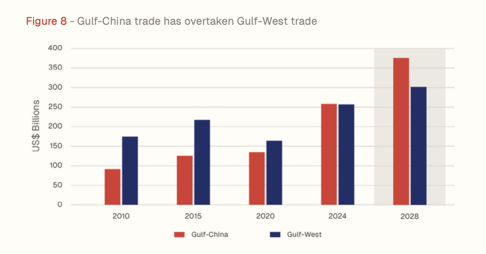 在这样的背景下,中国于2024年首次整体超越欧美,成为海湾最大的贸易伙伴。 Asia House 指出,这不是一次简单的排名变化,而是全球新增贸易与产业活动的重心,正在从“跨大西洋通道”,转向“亚洲—中东”这一新走廊。
