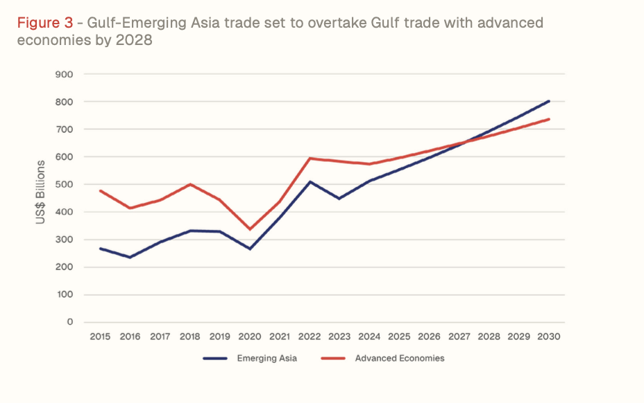 ▲预计到 2028 年,海湾—新兴亚洲贸易将超过海湾与发达经济体的贸易规模