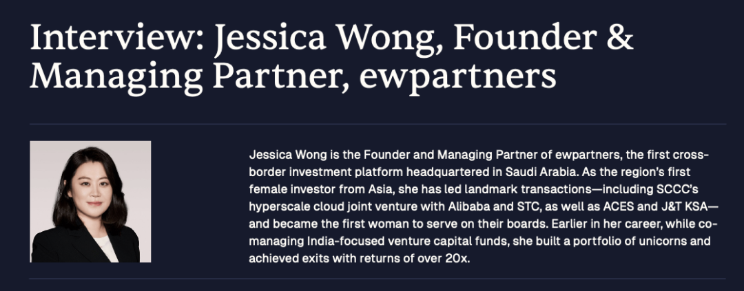 在最新一期逾百页的重磅研究中,易达资本(ewpartners)作为“海湾—亚洲跨境资本与产业合作的代表性案例”被重点收录。公司创始人兼管理合伙人 Jessica Wong 受邀接受独立专访,成为报告中为数不多来自亚洲的投资机构代表之一。