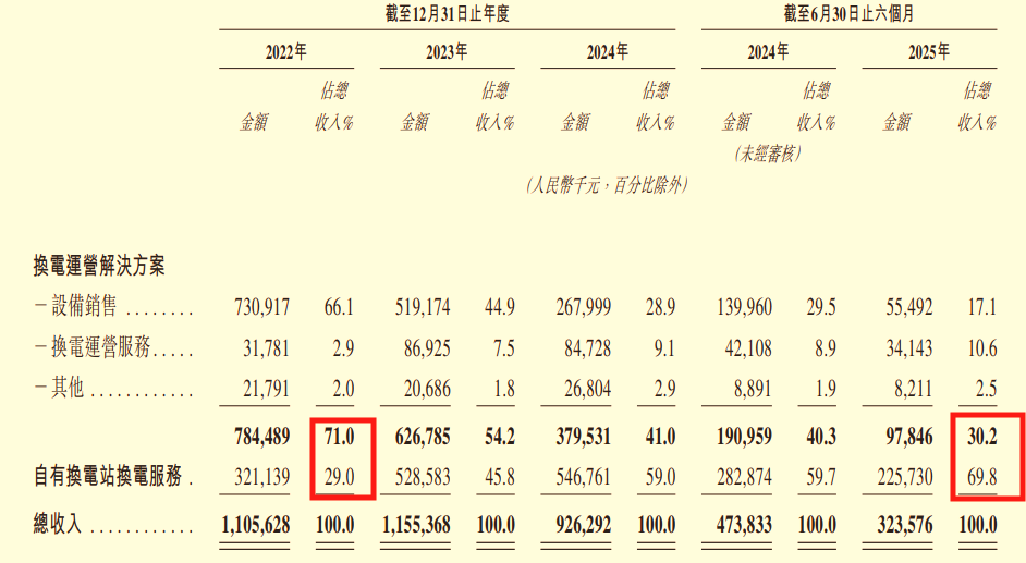 在发展初期,奥动的核心收入来源为换电设备销售。但后续公司业务重心逐步转向自营换电站的重资产模式。截至2025年上半年,奥动换电服务收入占比已跃升至69.8%,而设备销售收入占比则降至17.1%。