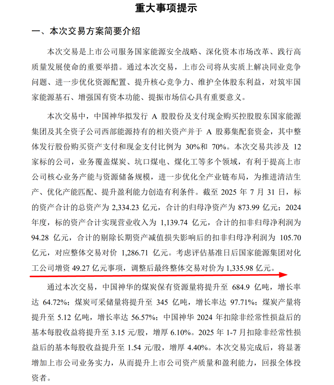 通过本次交易,中国神华的煤炭保有资源量将提升至684.9亿吨,增长率达64.72%;煤炭可采储量将提升至345亿吨,增长率达97.71%;煤炭产量将提升至5.12亿吨,增长率达56.57%;中国神华2024年每股收益将提升至3.15元/股,增厚6.1%。2025年1-7月每股收益提升至1.54元/股,增厚4.4%。