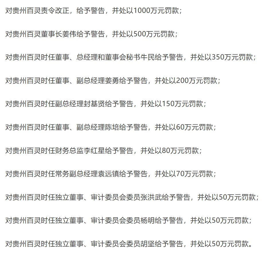 其中,对贵州百灵与公司董事长姜伟均为顶格处罚。