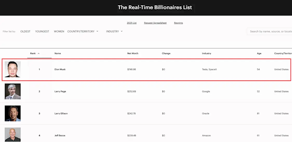 《福布斯》实时亿万富翁榜单显示,马斯克现在的净资产达到7489亿美元,牢牢占据世界首富位置。谷歌联合创始人拉里·佩奇(Larry Page)排在第二,净资产为2526亿美元,落后近5000亿美元。