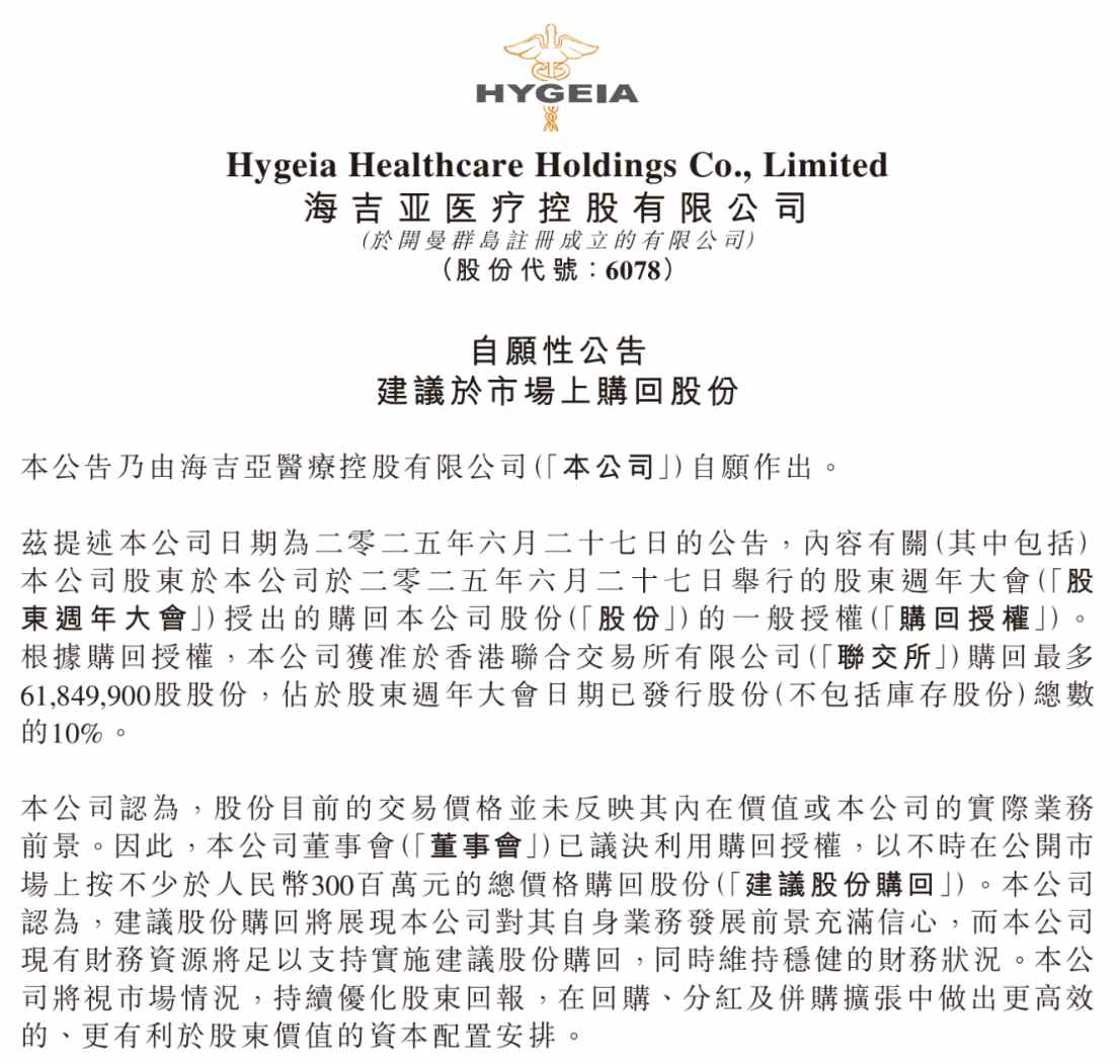 12月15日,海吉亚医疗(06078)发布一则回购公告,表示“股份目前的交易价格并未反映其内在价值或本公司的实际业务前景”,因此“公司董事会已议决利用购回授权,以不时在公开市场上按不少于人民币3亿元的总价格购回股份。”