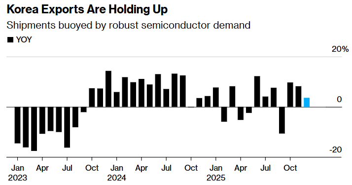 智通财经APP获悉,韩国强劲的半导体出口继续掩盖其他行业的疲软,帮助维持了12月前几周的整体出货额增长,韩国目前正在应对美国关税的影响。根据韩国海关周一公布的数据,经工作日差异调整后,12月前20天的出口额同比增长3.6%,上个月同期增速为8.2%。相比之下,11月份全月出口额修正后增幅为13%。未经调整的出口量也增长了 6.8%,而整体进口增长了 0.7%,促使贸易顺差达到 38 亿美元。