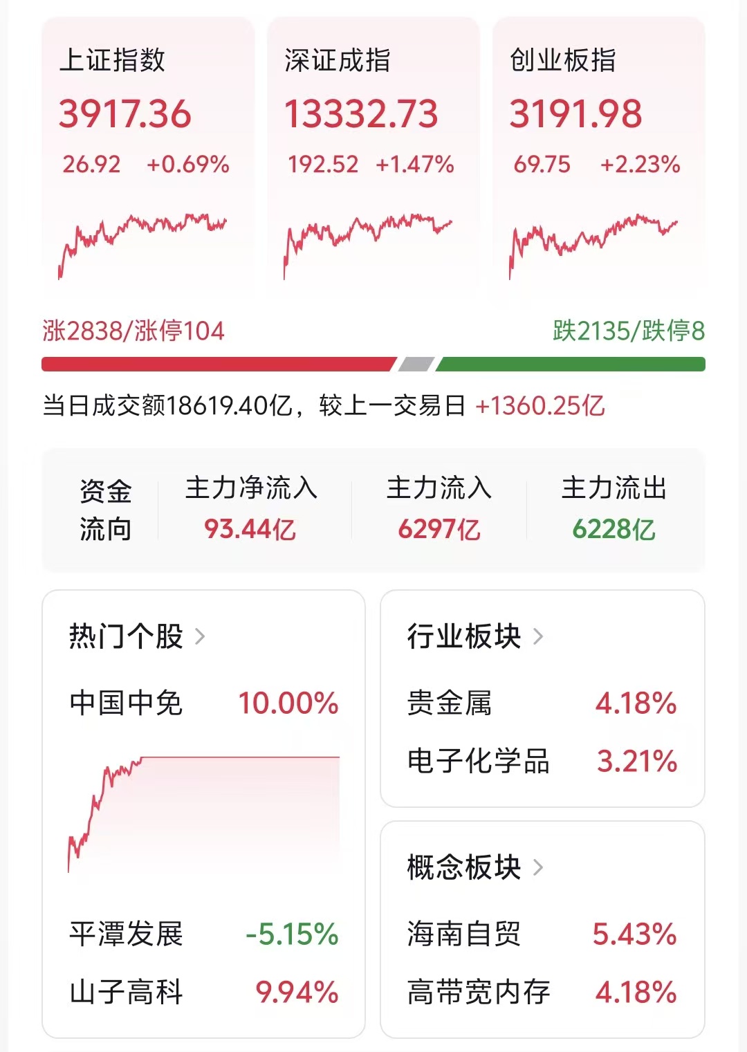 12月22日消息,市场高开高走,沪指涨0.66%收复3900点关口,截至收盘,沪指报3917.36点,涨0.69%;深证成指报13332.73点,涨1.47%;创指报3191.98点,涨2.23%。