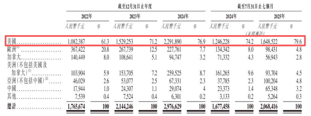 但业绩高增背后仍存在结构性隐忧,涛涛车业过去多年境外销售收入占比始终维持在99%以上,显著高于春风动力、隆鑫通用、力帆股份等同业公司。其中,美国是最大出口目的地,2025年前七个月,来自美国的销售收入占比进一步提高至79.6%。