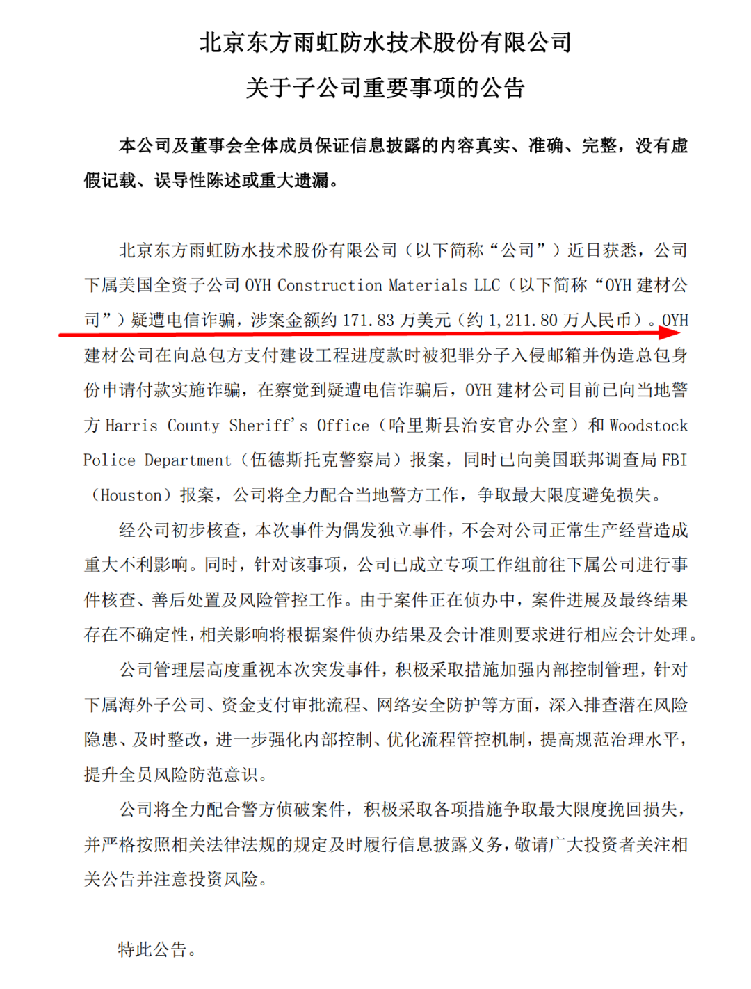 东方雨虹今日公告,公司近日获悉,公司下属美国全资子公司OYH建材公司疑遭电信诈骗,涉案金额约171.83万美元(约1211.8万人民币)。
