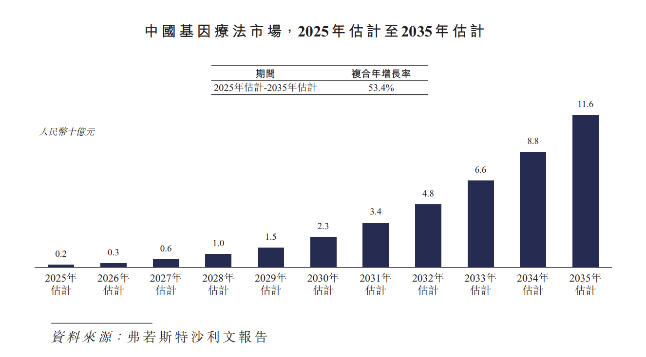 中国基因治疗市场亦蓄势待发,将迎来快速增长期。于2024年,中国基因疗法市场规模极小。该市场预计将于2025年至2035年以53.4%的复合年增长率增长,并于2035年达到人民币116亿元的市场规模。