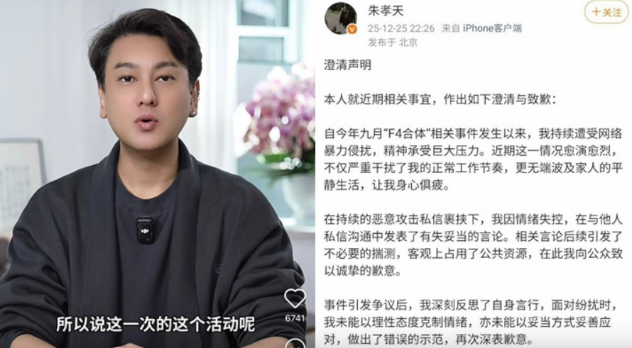 朱孝天昨晚发文道歉,表示自己因情绪失控,“在与他人私信沟通中发表了有失妥当的言论”,对于相关言论引发不必要的揣测,客观上占用了公共资源,在此向大众致歉。