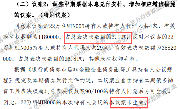 议案二为优化展期版本,在本金展期一年的基础上,承诺1.1亿元原利息于12月28日正常兑付,同时提出由万科提供增信,但未披露具体细节。这一调整与“22万科MTN004”二次方案的展期逻辑高度重合。但债权人认可度依然极低,仅获得3.19%的有效表决权同意,同样未达生效标准。