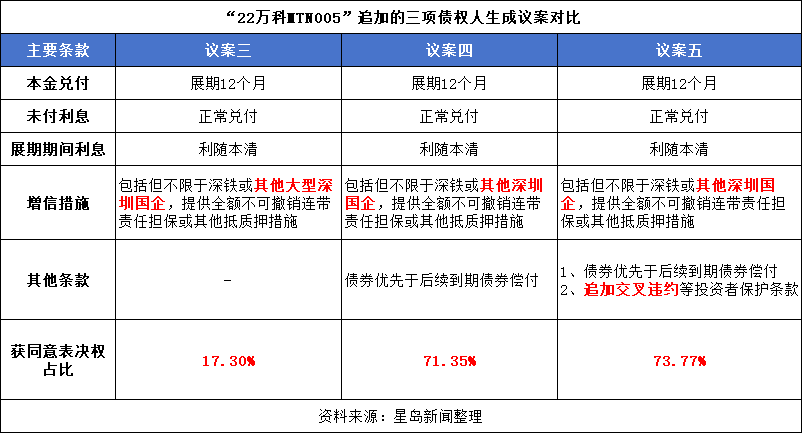 尽管债权人提出的增信方案更贴合市场风险防控需求,但最终均未达到90%的有效表决权生效门槛。其中,议案三获17.30%有效表决权同意,议案四、五的同意比例分别达到71.35%、73.77%,较万科提出的方案认可度显著提升,却仍未能通过。