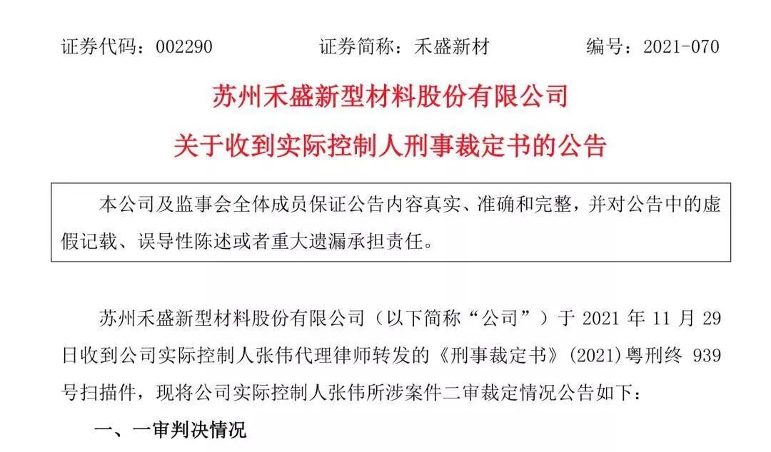 2021年11月29日晚间,禾盛新材披露公告,收到实控人张伟的刑事裁定书,张伟犯组织、领导黑社会性质组织罪、非法吸收公众存款罪、强迫交易罪等多达11项目罪名,数罪并罚,决定执行无期徒刑,剥夺政治权利终身,并处没收个人全部财产,罚金1217万元。