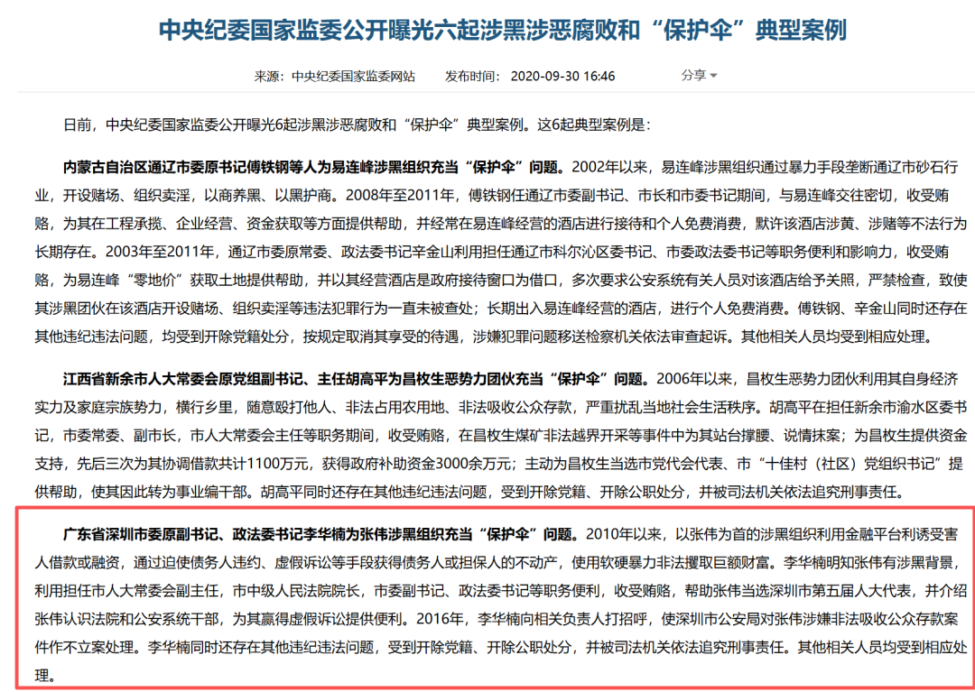 值得注意的是,广东省深圳市委原副书记、政法委书记李华楠为张伟涉黑组织充当“保护伞”。