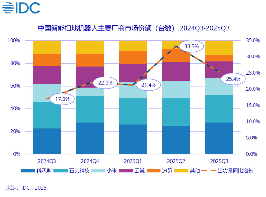 另外,小米(1810.HK)仍主打中端性价比路线,全球市场份额达10%,正在向高端产品线拓展;云鲸在美国及亚太核心区域的市场份额大幅增长,前三季度出货量跻身全球前五,海外市场份额大幅增长。