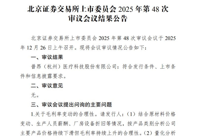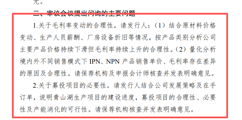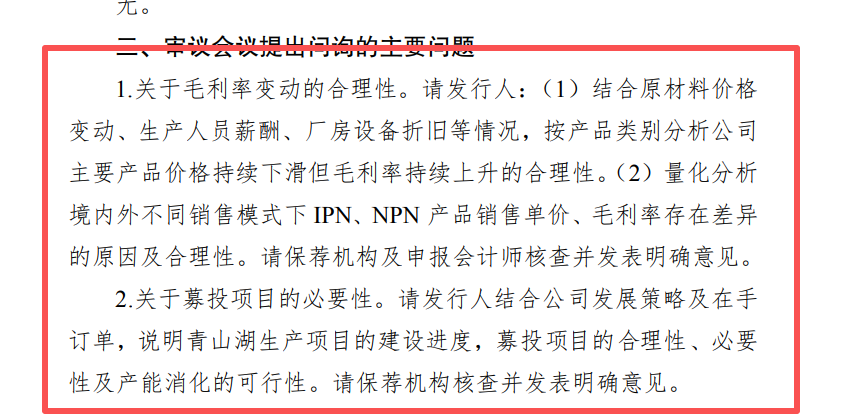 根据公告,审议会议提出问询的主要问题涉及毛利率及募投项目。普昂医疗被要求结合原材料价格变动、生产人员薪酬、厂房设备折旧等情况,按产品类别分析公司主要产品价格持续下滑但毛利率持续上升的合理性。量化分析境内外不同销售模式下 IPN、NPN 产品销售单价、毛利率存在差异的原因及合理性。