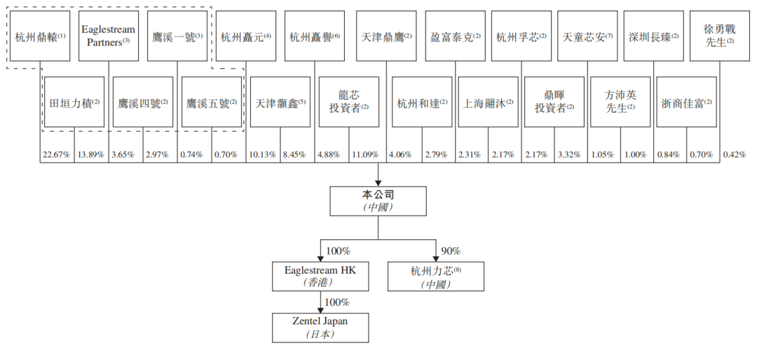 其上市股权架构中,有28位直接股东,股权相对分散。杭州鼎辕作为第一大股东直接持股22.67%;应伟不直接持股,其通过杭州鼎辕、田垣力积、鹰溪一号、鹰溪四号、鹰溪五号、Eaglestream Partners控制44.6%的权益。