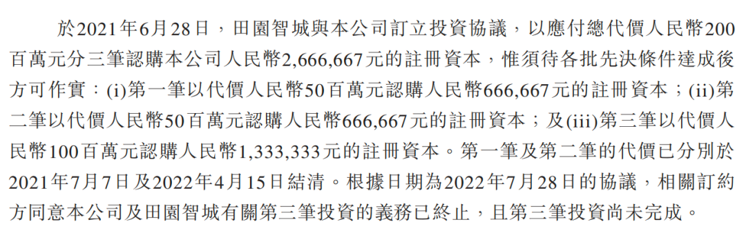 2021年6月28日,田园智城与力积存储签订协议,附“先决条件”以2亿元分三笔认购力积存储约266.67万元注册资本,2021年7月和2022年4月,前两笔以5000万元认购66.67万元注册资本结清,第三笔投资义务终止,合计出资1亿元。田园智城成立于2012年11月,实控人为金华市国资委。