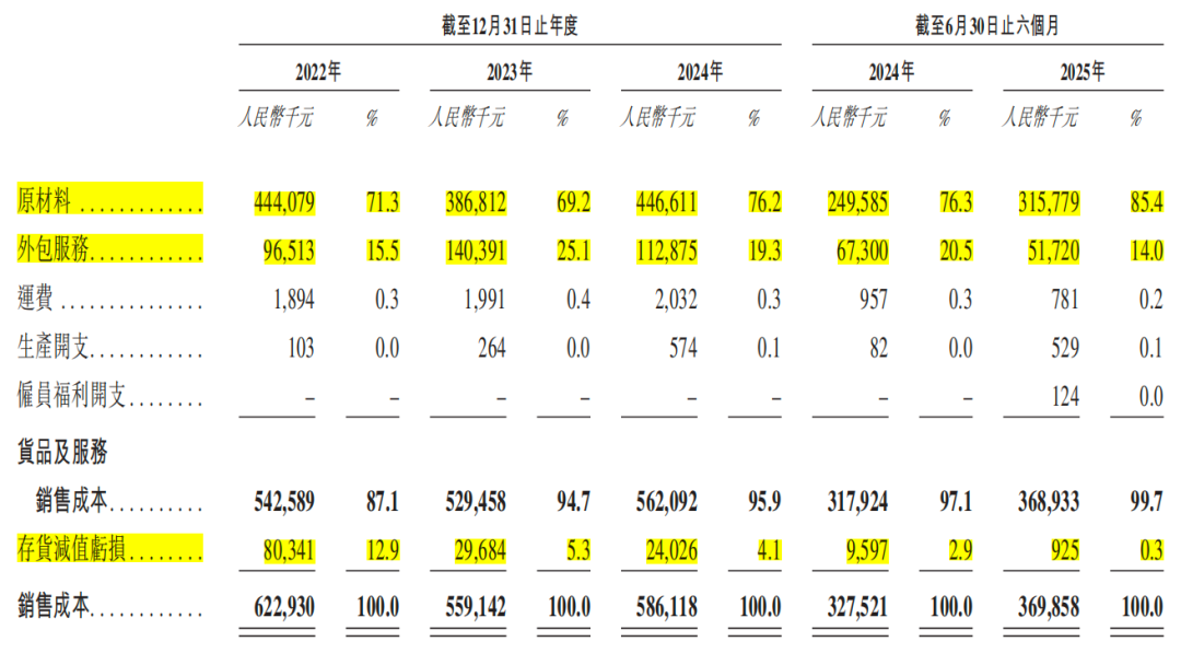 DRAM成本主要由晶圆制造、封装及测试构成。其中晶圆制造约占总成本的70%-80%,封装及测试占比约20%-30%。2022年-2024年以及2025年1-6月(简称:报告期),力积存储销售成本中,原材料成本和外包服务成本合计占比分别为86.8%、94.3%、95.5%、99.4%,生产成本几乎为0。