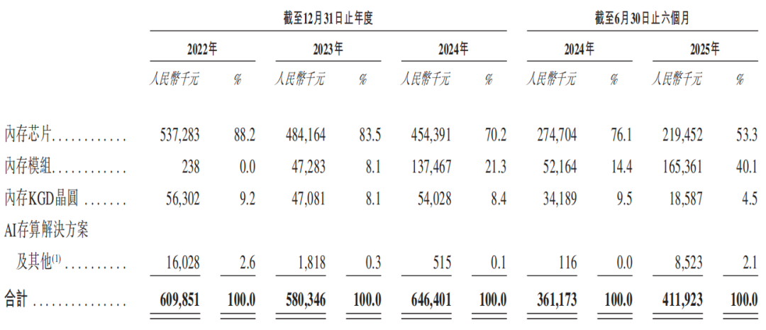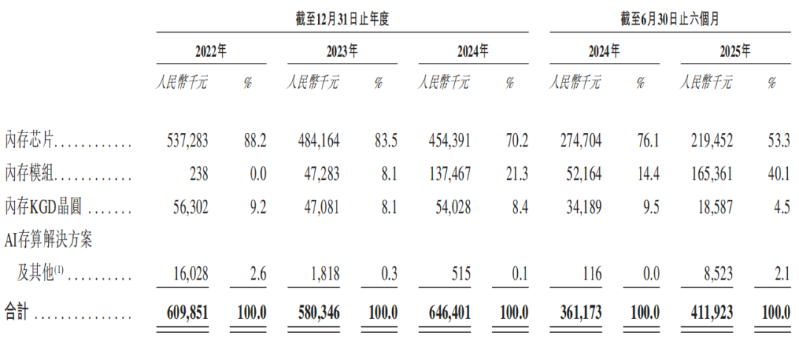 反观核心产品内存芯片的收入占比从88.2%逐年下降至70.2%,2025年上半年收入同比下滑20.11%,收入占比同比减少22.8个百分点,降至53.3%。