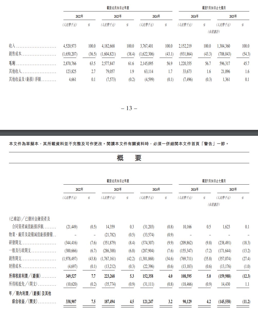 公司于2022年度、2023年度、2024年度、2025年截至7月31日止七个月分别录得毛利约为28.71亿元、25.78亿元、21.45亿元、5.96亿元人民币。同期,毛利率分别为63.5%、61.6%、56.9%及45.7%。