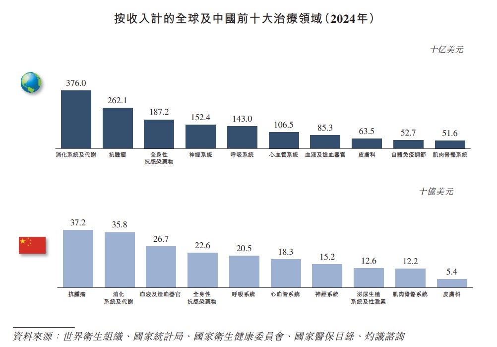 2024年,全球收入排名前五的治疗领域分别为消化及代谢、抗肿瘤/肿瘤学、全身性抗感染药物、神经系统及呼吸系统。中国前五大治疗领域分别为抗肿瘤、消化及代谢、血液及造血器官、全身性抗感染药物及呼吸系统。该等市场的增长受到对肿瘤、代谢、血液、感染及呼吸系统治疗的强劲需求所推动。