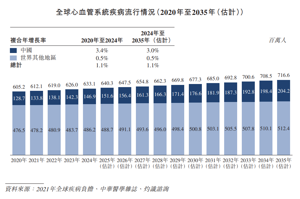 心脑血管系统由心脏、血管及脑血管组成。该系统通过输送氧气与营养素及清除代谢废物维持大脑和全身的血液循环。全球心血管系统疾病患病人口由2020年的6.05亿人增加至2024年的6.33亿人,复合年增长率为1.1%,预计到2035年将达至7.17亿人,2024年至2035年的复合年增长率为1.1%。中国心血管系统疾病流行情况由2020年的1.29亿人增加至2024年的1.47亿人,复合年增长率为3.4%,预计到2035年将达至2.04亿人,2024年至2035年的复合年增长率为3.0%。