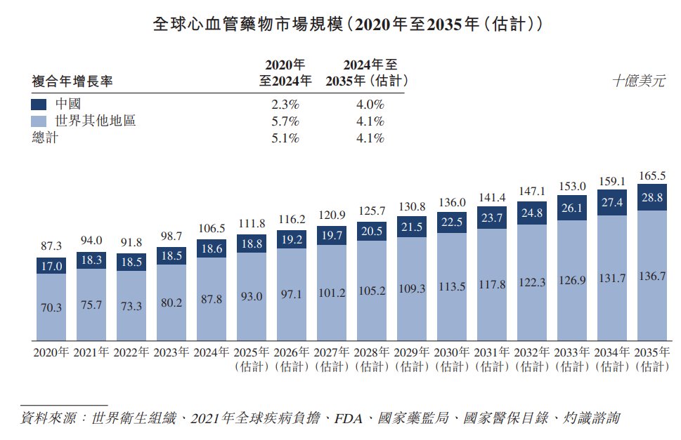 受人口老龄化、心血管疾病患病率上升、诊断和治疗普及率提高以及持续采用更多成熟和创新疗法所推动,全球心血管药物市场由2020年的873亿美元增加至2024年的1065亿美元,复合年增长率为5.1%,预计到2035年将达到1655亿美元,2024年至2035年的复合年增长率为4.1%。