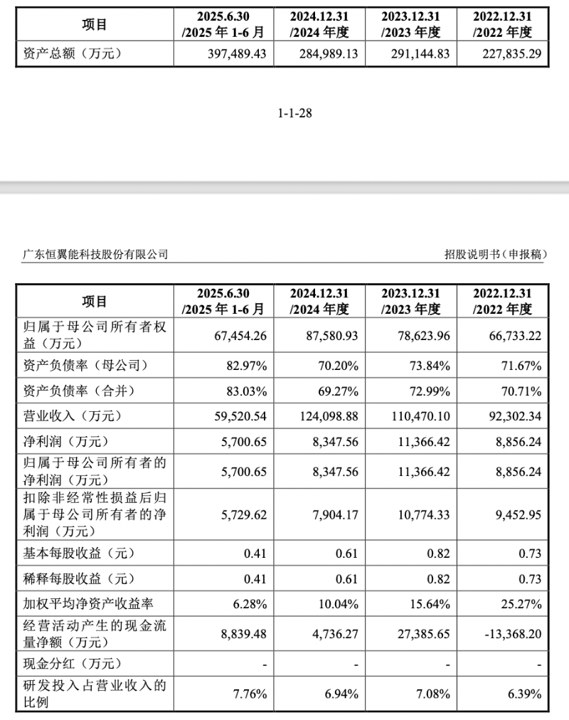 据招股书,2022年-2024年及2025上半年,恒翼能实现营收分别为9.23亿元、11.05亿元、12.41亿元、5.95亿元;归母净利润分别为8856.24万元、1.14亿元、8347.56万元、5700.65万元。