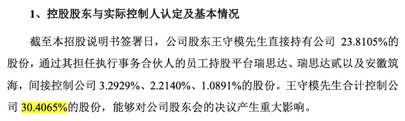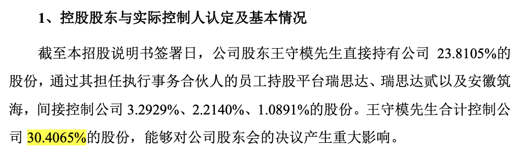 截至本招股说明书签署日,公司股东王守模直接持有公司23.8105%的股份,通过其担任执行事务合伙人的员工持股平台瑞思达、瑞思达贰以及安徽筑海,间接控制公司3.2929%、2.2140%、1.0891%的股份。王守模合计控制公司30.4065%的股份,能够对公司股东会的决议产生重大影响。