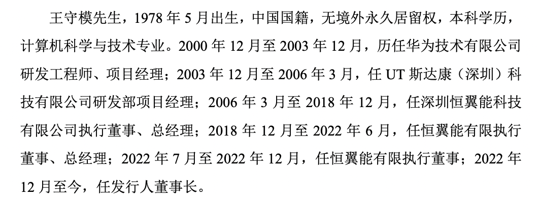 资料显示,王守模,1978年5月出生,中国国籍,无境外永久居留权,本科学历,计算机科学与技术专业。2000年12月至2003年12月,历任华为技术有限公司研发工程师、项目经理;2003年12月至2006年3月,任UT斯达康(深圳)科技有限公司研发部项目经理;2006年3月至2018年12月,任深圳恒翼能科技有限公司执行董事、总经理;2018年12月至2022年6月,任恒翼能有限执行董事、总经理;2022年7月至2022年12月,任恒翼能有限执行董事;2022年12月至今,任公司董事长。