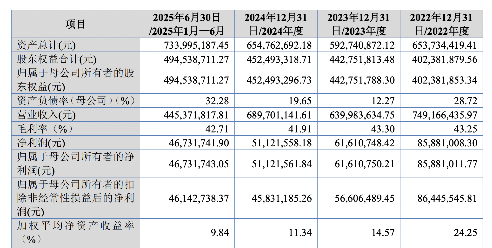 2022年-2024年及2025年上半年,国贵科技营业收入分别为7.49亿元、6.4亿元、6.9亿元及4.45亿元;净利润分别为8588.1万元、6161.07万元、5112.16万元及4673.17万元;毛利率分别为43.25%、43.3%、41.91%、42.71%。
