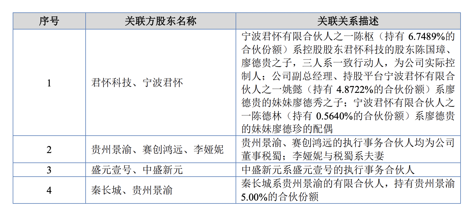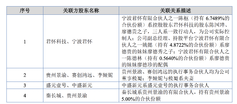 另外,宁波君怀持股1.37%。其中,宁波君怀由有限合伙陈枢、姚懿、陈德林分别持有6.75%、4.87%、0.56%的合伙份额。姚懿系廖德贵的妹妹廖德秀之子;陈德林系廖德贵的妹妹廖德珍的配偶。
