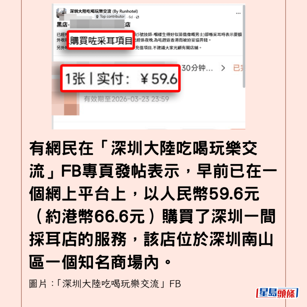 有网民在“深圳大陆吃喝玩乐交流”FB专页发帖表示,早前已在一个网上平台上,以人民币59.6元(约港币66.6元)购买了深圳一间采耳店的服务,该店位于深圳南山区一个知名商场内。