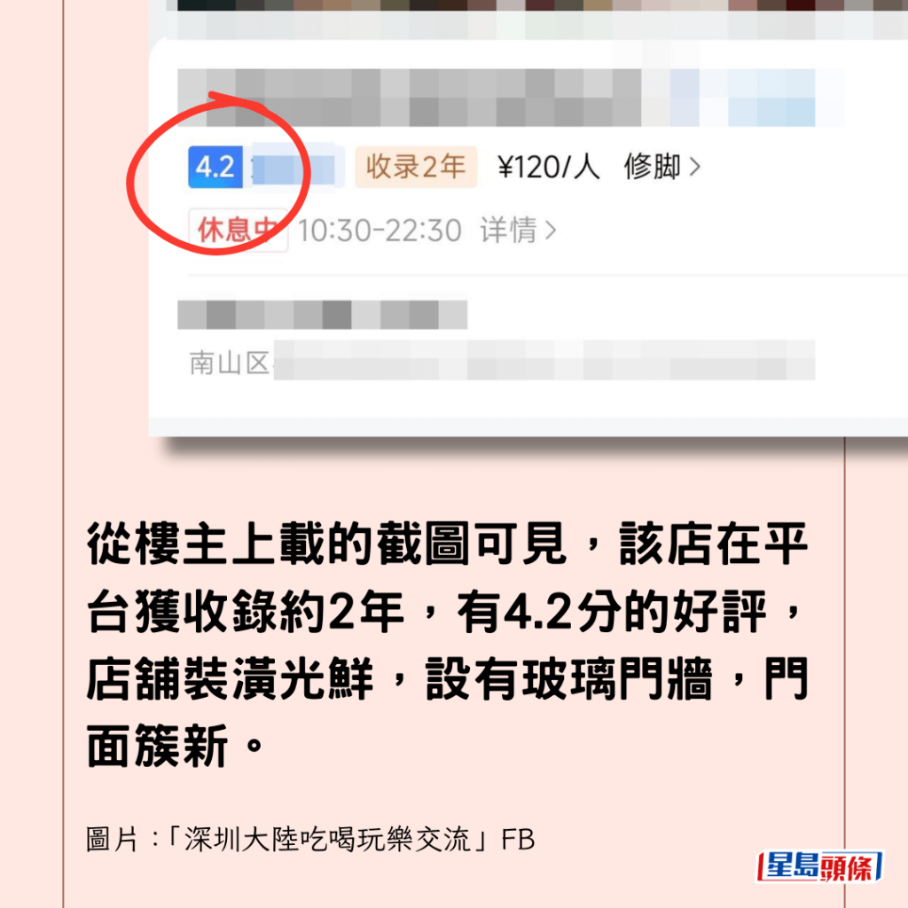 从楼主上载的截图可见,该店在平台获收录约2年,有4.2分的好评,店铺装潢光鲜,设有玻璃门墙,门面簇新。