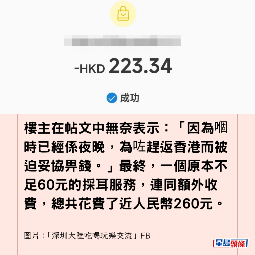 楼主在帖文中表示,他在享受服务时,一位被形容为“嗰样生得好似苗侨伟”的男技师,在采耳途中突然表示楼主的耳屎太多,要求额外再收取人民币200元(约港币223.34元)才肯继续清理。楼主在帖文中无奈表示:“因为嗰时已经系夜晚,为咗赶返香港而被迫妥协畀钱。”最终,一个原本不足60元的采耳服务,连同额外收费,总共花费了近人民币260元。