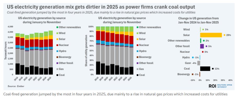 尽管天然气仍是美国电力主要来源,但2025年燃气价格暴涨挤压电厂利润,刺激煤电产出出现最大增幅。