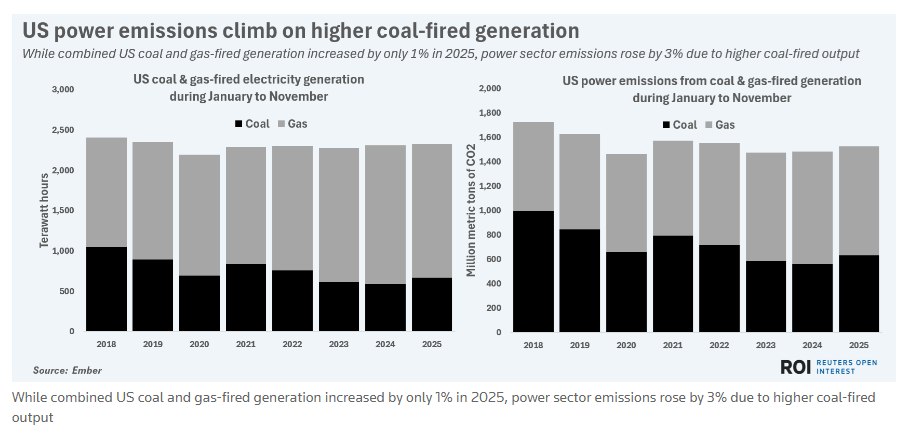 Ember数据显示,1-11月美国煤电产量同比增长13%,创近三年新高。由于煤电二氧化碳排放强度远超气电(每太瓦时煤电排放超90万吨二氧化碳,气电约55万吨),2025年美国电力行业碳排放量同步上升。前11个月煤电与气电碳排放总量达15.26亿吨,较2024年同期增长3%,创2021年以来最高水平。