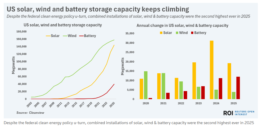 尽管2025年美国煤电消费量上升,但其电池储能装机同样创下纪录,旨在消纳富余风光电力。清洁能源数据门户Cleanview统计显示,2025年美国电池储能装机总量突破39吉瓦,较2024年增长43%。