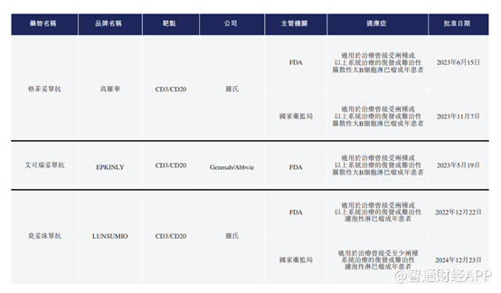 目前全球范围内共有3款CD3/CD20双抗获批上市,中国有两款CD3/CD20 TCE获批。
