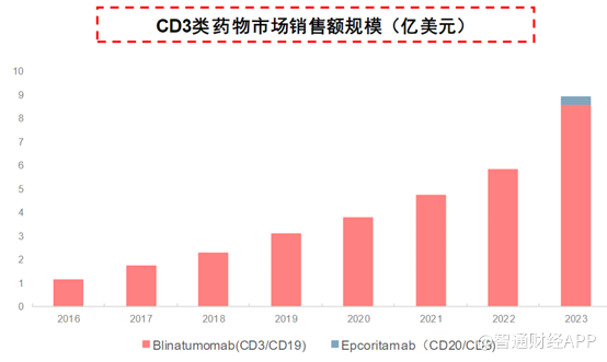 根据公开消息,2023年CD3/CD19双抗药物Blinatumomab销售额为8.61亿美金,CD3/CD20类药物Epcoritamab销售额为0.31亿美金,总计约10亿美金。