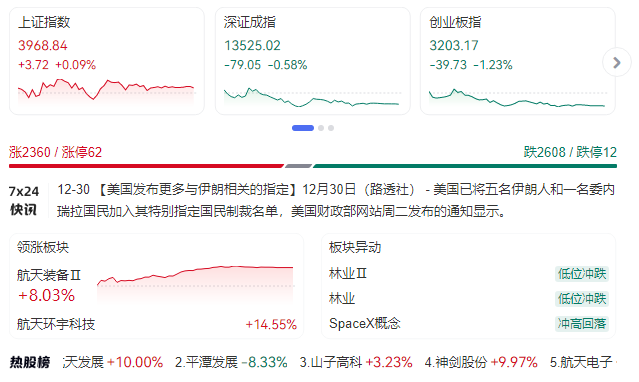 12月31日消息,三大股指涨跌不一,深成指、创指高开低走,创指跌超1%。板块方面,商业航天概念持续爆发,十余只成分股涨停,中国卫通4天2板续创历史新高;AI应用端表现活跃,福石控股涨超10%;数字货币概念震荡走强,易点天下涨近10%涨幅居前;下跌方面,白酒板块持续下挫,古井贡酒跌幅居前;半导体概念股集体走低,赛微电子、寒武纪领跌;贵金属板块震荡走弱,晓程科技领跌。总体来看,个股跌多涨少,下跌个股超2700只。截至收盘,沪指报3968.84点,涨0.09%;深成指报13525.02点,跌0.58%;创指报3203.17点,跌1.23%。