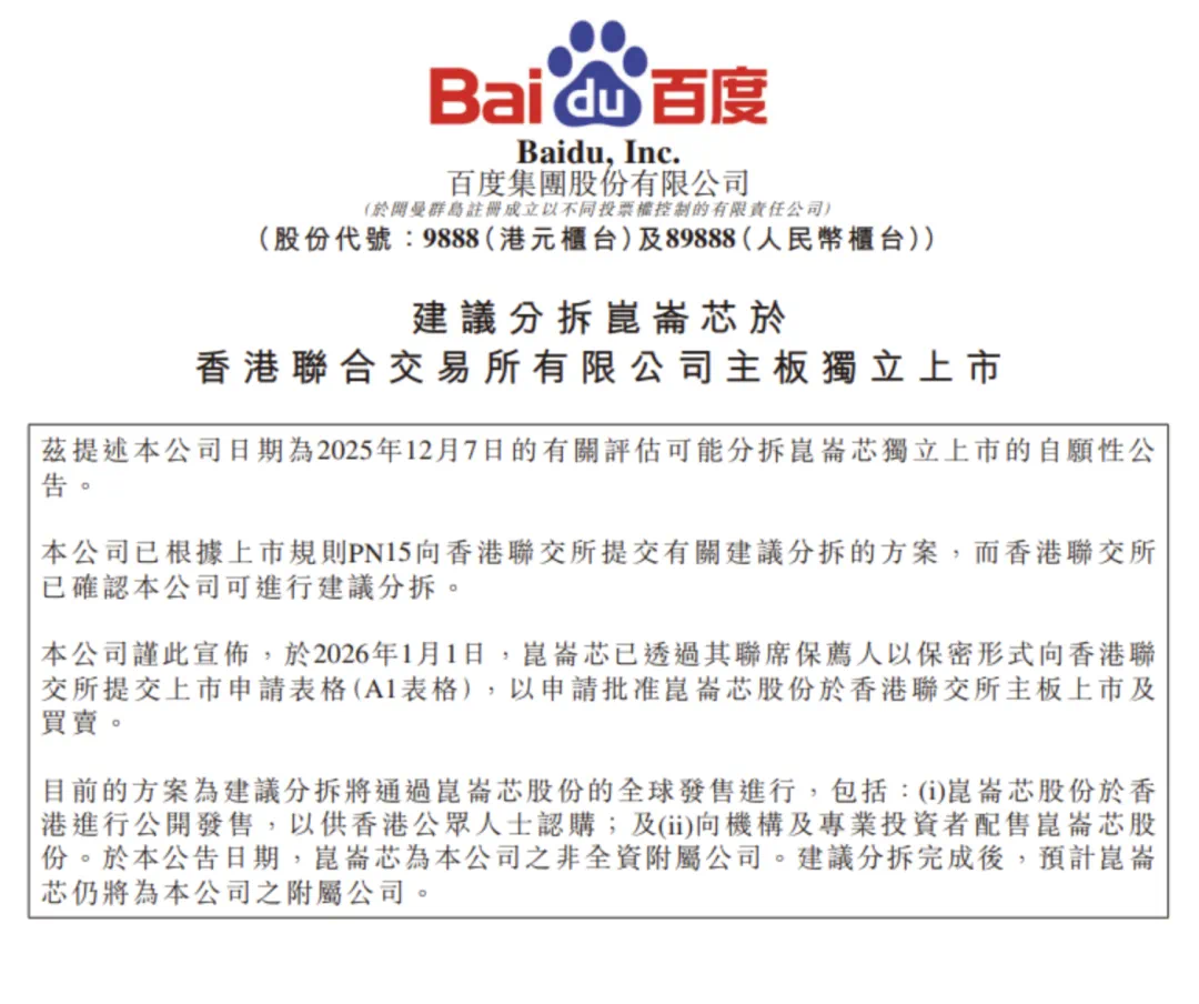 1月2日,百度发布公告称,1月1日,昆仑芯已透过其联席保荐人以保密形式向香港联交所提交上市申请表格(A1表格),以申请批准昆仑芯股份于香港联交所主板上市及买卖。目前的方案为建议分拆将通过昆仑芯股份的全球发售进行,包括:(i)昆仑芯股份于香港进行公开发售,以供香港公众人士认购;及(ii)向机构及专业投资者配售昆仑芯股份。于本公告日期,昆仑芯为本公司之非全资附属公司。建议分拆完成后,预计昆仑芯仍将为本公司之附属公司。