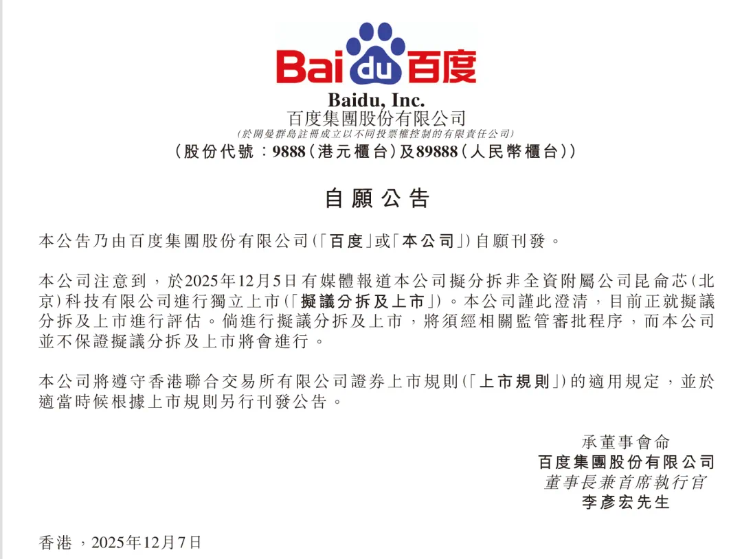 然而,12月7日,百度集团港股公告称,公司注意到,于2025年12月5日有媒体报道公司拟分拆非全资附属公司昆仑芯(北京)科技有限公司进行独立上市。公司表示,目前正就拟议分拆及上市进行评估。倘进行拟议分拆及上市,将须经相关监管审批程序,而公司并不保证拟议分拆及上市将会进行。