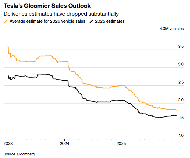 华尔街对特斯拉2026年的汽车销售前景同样愈发悲观。就在两年前,分析师们还预计特斯拉的年交付量将超过300万辆。而如今,对2026年交付量的平均预测已骤降至约180万辆。